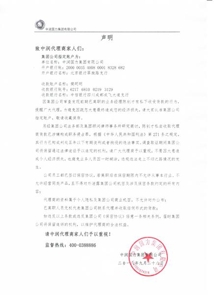 因集团公司审查发现前期已离职的业务经理陈钊才有私下收受货款的行为,提醒广大代理,为避免因疏忽大意最终造成您的经济损失,请大家认准集团公司指定账户,敬请收藏保存。